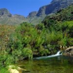 Covering 71,000 Ha of rocky terrain, the Cederberg Wilderness Area is one of South Africa’s most impressive hiking areas. It consists of several parallel ridges which contain some significant peaks, the highest of which is Sneeuberg (“Snow Mountain”) at 2027m. The area is best known for its fantastic rock formations, including the Wolfberg Arch, Wolfberg Cracks and the 20m high Maltese Cross which have been formed by acidic rain and snow eating into the quartzitic sandstone boulders and cliffs. A prominent shale band forms a level platform known as Die Trap (The Step) around most of the major peaks, giving relatively straightforward hiking access to much of the range. The bare, peaked ridges, with their brilliant white rock and sand, are separated by deep river valleys which are often blocked by almost impenetrable riverine bush. In places, vertical rock folds have been left jutting out of the earth.