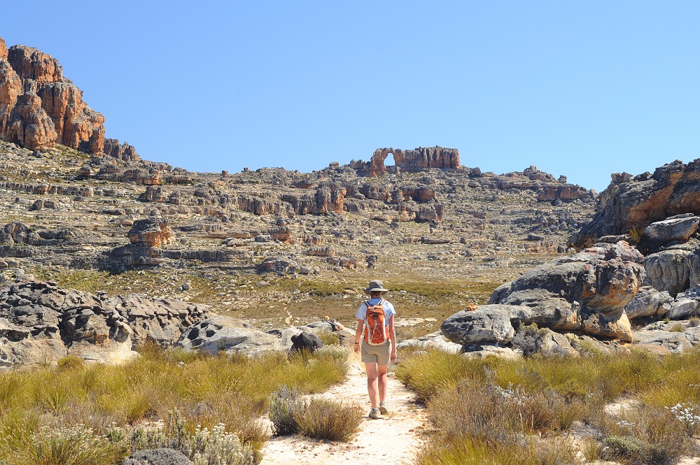 Most hikers visiting the Cederberg seek to take in the main trekking symbols of the range, notably the Maltese Cross and the Wolfberg Cross and Arch. Shorter Cederberg hikes requiring between 2 and 3 hours, normally made on arrival day and departure day, are to the Stadstaal Caves and the cedar trees above Algeria; the short river walk to Malgaat, close to the chalets at Sanddrif is also pretty. If you are fit, it’s possible to extend the Maltese Cross hike to gain the summit of Sneeuberg (2027m), although there is scrambling involved on the summit – the scrambling is not tricky, but route-finding is. An alternative is to make this ascent over two days and either camp on Die Trap, ready for a morning ascent of the final section, or sleep in the Sneeuberg bothy, a very basic shelter. Tafelberg (1969m) is the Cederberg’s second major summit and is sometimes included as a trekking objective. However, the summit block is generally the preserve of rock climbers and serious scramblers and is not summited by hikers. There are nice circuits for the fit which can be accessed from Algeria, which lies further north, and which are preferable to Tafelberg if exposed scrambling is not your bag. The Cederberg is riddled with San Rock Art and one of the best ways of seeing a good selection is to walk the 8-kilometre Sevilla Trail at the extreme northern end of the range. Much can be covered in a 4-day/3-night itinerary from Cape Town, although 4 nights give you more scope.