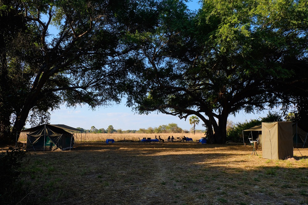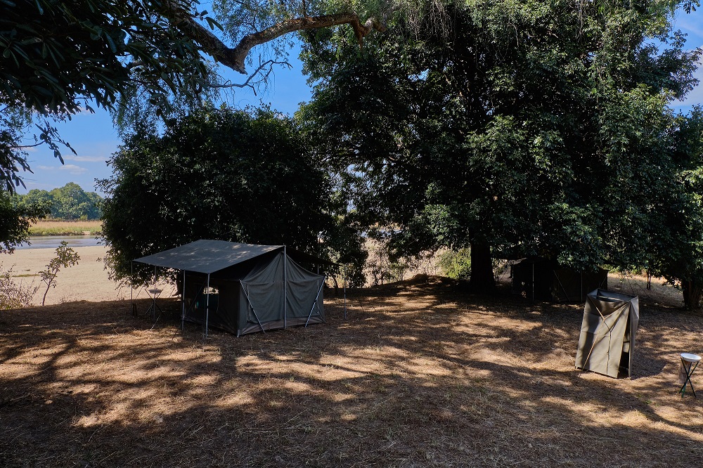 All camping positions on this safari are in wonderful wild locations, in shaded positions close to the river. This is a traditional tented bush camp set-up, using large, walk-in tents with mesh windows and doors to aid air circulation. Emphasis is placed on essential comforts and thoughtful touches: framed beds with a proper mattress, bedside table, luggage rack, reed mats, pressed koi-koi, basin on a stand with mirror, wooden loos over a long-drop with a bucket of sand and a shovel, and hot-bucket showers.